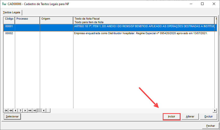 Abrirá a janela "CAD00006 - Cadastro de Textos Legais para NF".