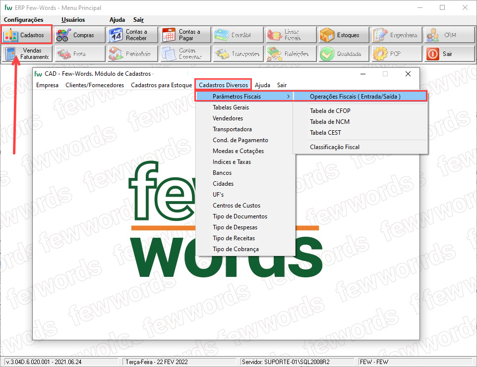 No menu principal do sistema clique no botão "Cadastros" em seguida "Cadastros Diversos"/"Parâmetros Fiscais"/"Operações Fiscais (Entrada/Saídas).