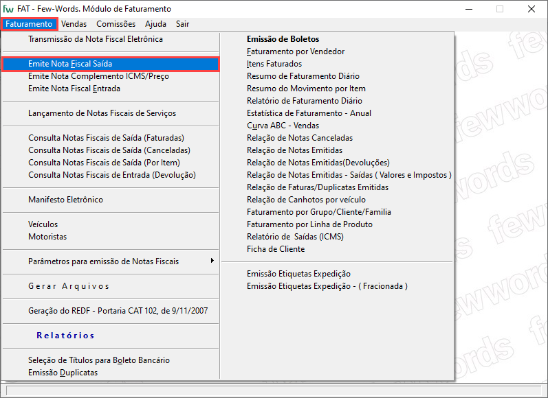 2. Clique na opção "Faturamento" e em seguida "Emite Nota Fiscal Saída".