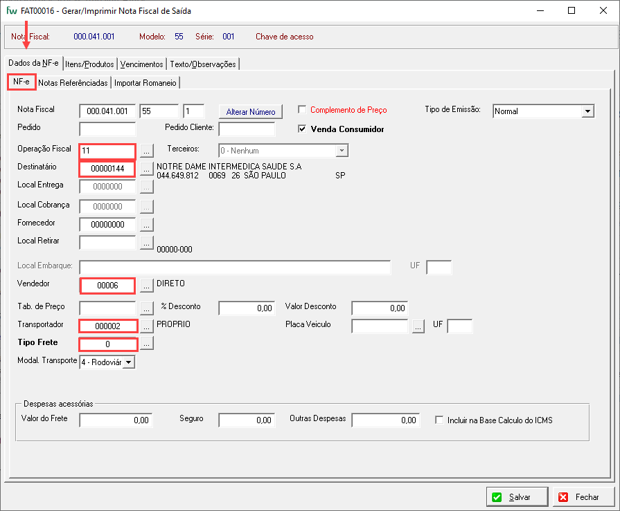 4. Nesta guia os principais campos para preenchimento são: "Operação Fiscal", "Destinatário", "Vendedor", "Transportador " e "Tipo de Frete".