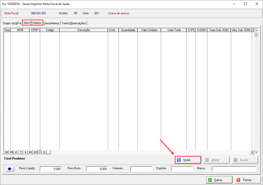 6. Abrirá a tela FAT00015 - Inclusão de Itens.