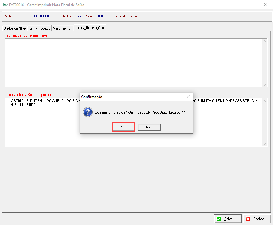11. Após imprimir ou fechar o preview da cópia do DANFE, o sistema apresentará uma mensagem de confirmação. Clique no botão "SIM" para confirmar e finalizar a emissão da Nota Fiscal.
