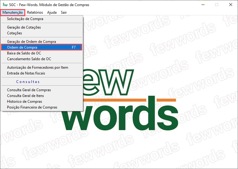 Clique no menu "Manutenção" e em seguida "Ordem de Compra".