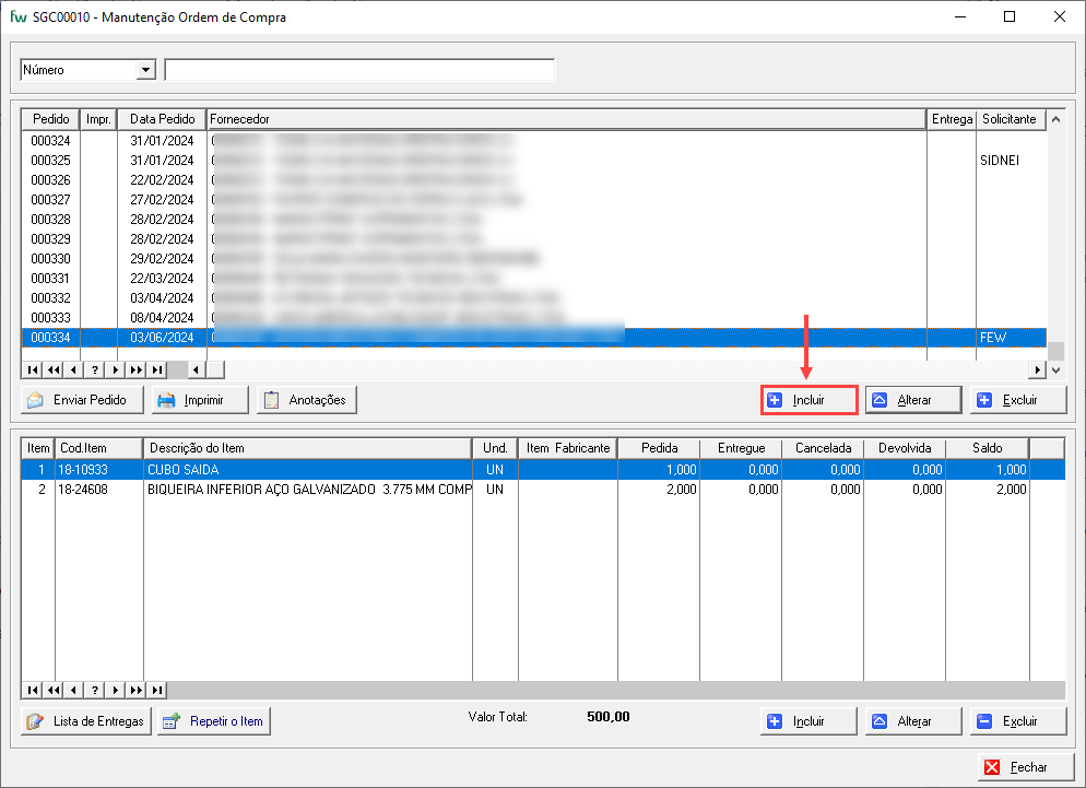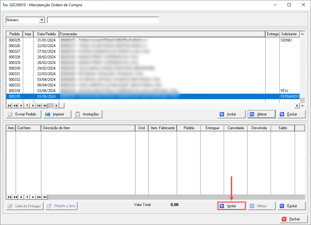 Na parte inferior da janela "Manutenção Ordem de Compra", clique no botão "Incluir".