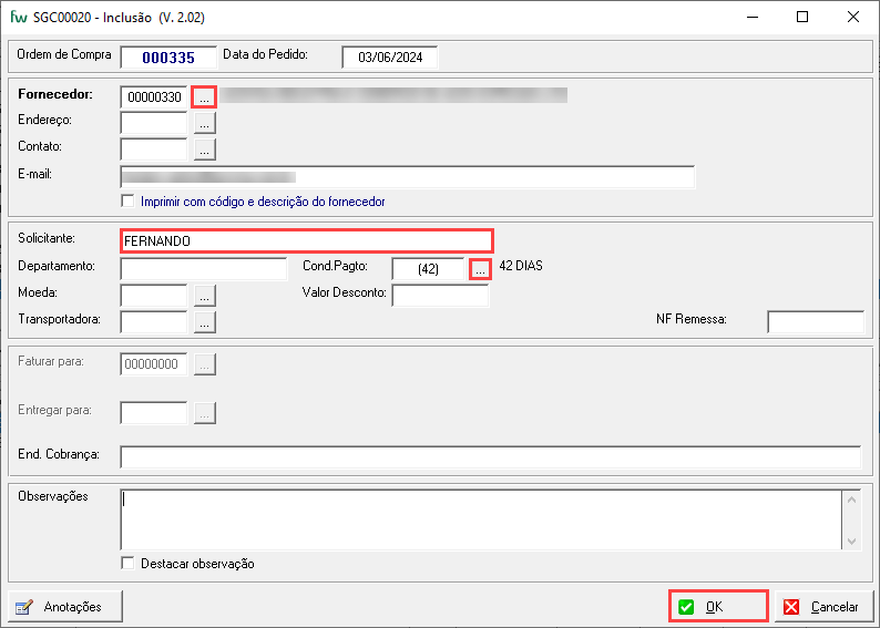 Nota: Para inclusão de itens na Ordem de Compra, é necessário cadastrar os itens no Fornecedor.