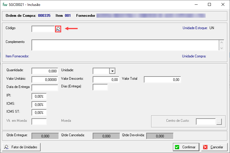 Para selecionar o item previamente cadastrado no fornecedor, clique no botão do campo "Código".
