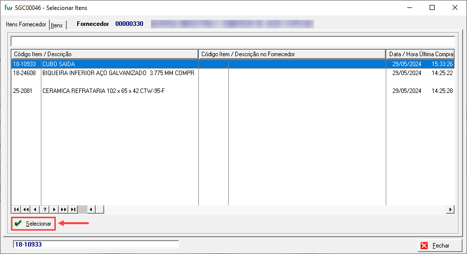 Abrirá a janela "Selecionar Itens", com os itens cadastrados no respectivo fornecedor.