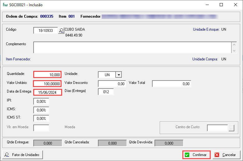 Observação: Os campos relacionados ao valor unitário e alíquotas dos impostos, serão preenchidos, conforme atualização do preço no cadastro do item no Fornecedor.