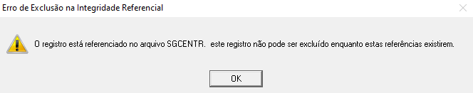 Ao realizar a exclusão de uma Ordem de Compra no sistema e a mesma possuir entrega, será apresentada a seguinte mensagem: