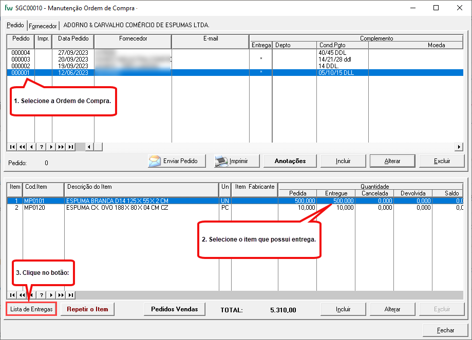 Na janela de "Manutenção de Ordem de Compra", o sistema disponibiliza um botão chamado "Lista de Entregas", onde é possível verificar qual Nota Fiscal o item possui vínculo.