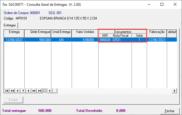 Na coluna "Documentos" é possível identificar os números de NIR e Nota Fiscal em que a Ordem de Compra foi referenciada.