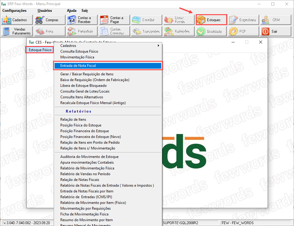 Ao identificar a Nota Fiscal que está vinculada a Ordem de Compra, no menu principal do sistema clique no botão "Estoques", em seguida "Estoque Físico" e "Entrada de Nota Fiscal".