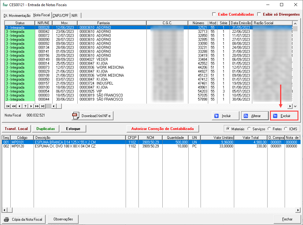 Encontre a Nota Fiscal, selecione e clique no botão "Excluir".