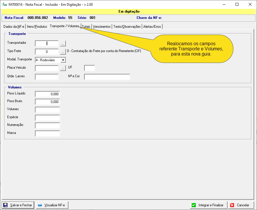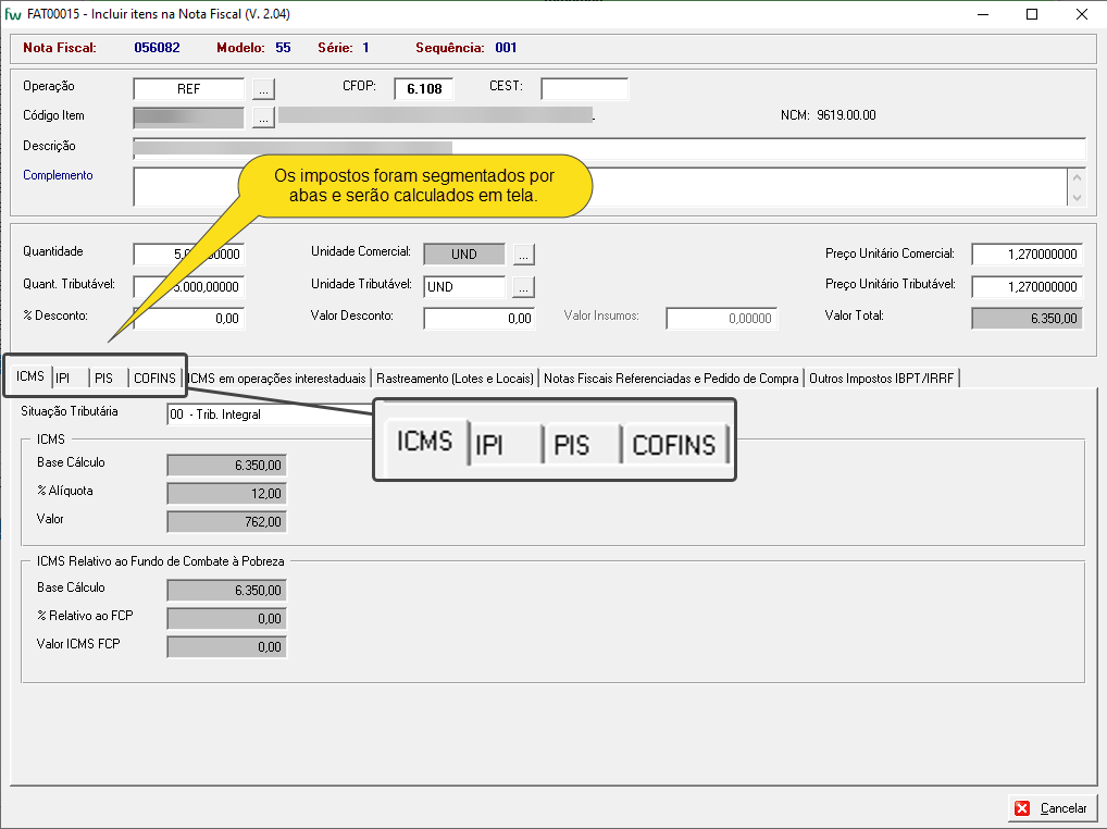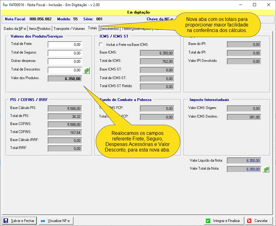 Os totais da Nota Fiscal são exibidos de forma automática na tela, facilitando a conferência dos valores durante a emissão.